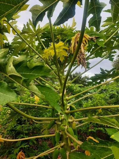 Hi. This is 1.5 years old Seedless Papaya Tree planted in Ludhiana Punjab. Please help me to identify the problem and treat it. It was so beautiful and full of very large lush green leaves but, since last month its leaves are changing color and finally they shed off. Its canopy has reduced a lot due to loss of leaves. A month ago I noticed something like worms on its going to ripe fruits which were fixed as they were fixed with fevicol ! But they were not worms I think and now it is alright without any medication. Please guide.