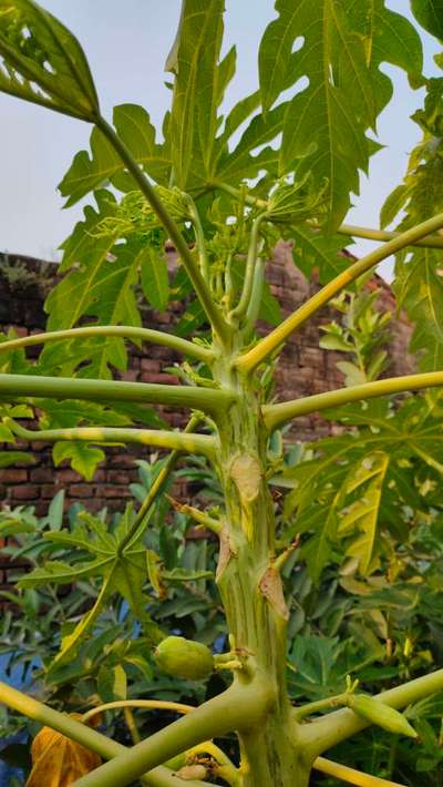Papaya stem looks loke snake pattern , there are many black mark on stem. The growth of papaya plant stopped and its leaves growth also stopped