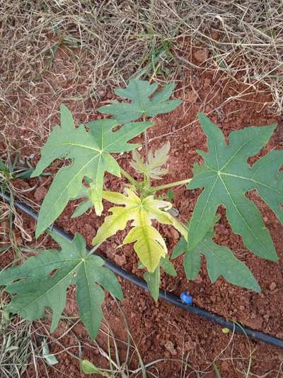 Hi Chandu T.S. Your papaya crop is severely effected by Iron Deficiency . Click on green link for checking symptoms and taking control measures from Plantix library. Also need to apply good amount of Farm Yard manure or Vermicompost once in 6 months along with recommended dosage of fertilizers of your area. Or you can also use fertilizer calculater available here on home page of Plantix to increase your crop growth and productivity.
