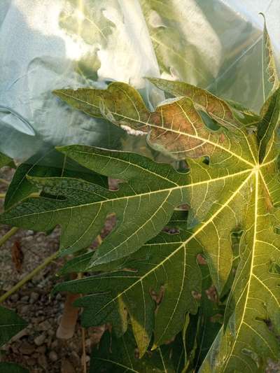 Hi Ehsan Qadír . I am not sure, but compare symptoms with Papaya Mosaic Virus and Magnesium Deficiency by clicking on green links for taking control measures from Plantix library. Also need to apply good amount of Farm Yard manure or Vermicompost once in 6 months along with recommended dosage of fertilizers of your area. Or you can use fertilizer calculater available here on home page of Plantix to increase your crop growth and productivity. Try well and take care of your papaya crop please.