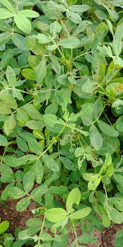 Hi, Kanu Ahir. Welcome to plantix. Your crop is effected by Tobacco CaterpillarFreshly hatched larvae feed gregariously, scraping the chlorophyll, soon dispose. Later stages feed voraciously on the foliage at night, hiding usually in the soil around the base of the plants during the day. Sometimes the feeding is so heavy that only petioles and branches are left behind if proper measures are not taken in time, specially in light soils, caterpillars bores into the pods. For control measures: Visit Plantix library or click on blue link given above to get more knowledge to control caterpillar pest in groundnut. Thank you. Visit again.