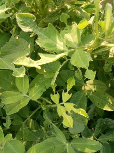 What's wrong with my peanut crop after irrigation 1) it's color changed to yellowish green and 2)leaves of plant having holes.