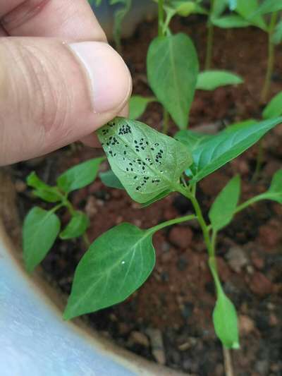 Learn more about PlantixSmall chilly plant....Softer leafs have these black spots on the underside with white powder. Black spots look like tiny eggs of some insect