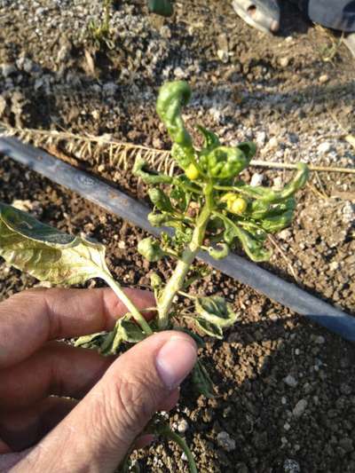 Yes this is leaf curl virus and once infected there is no control measure, so control vectors (white fly and thrips) right from transplanting. Thanks