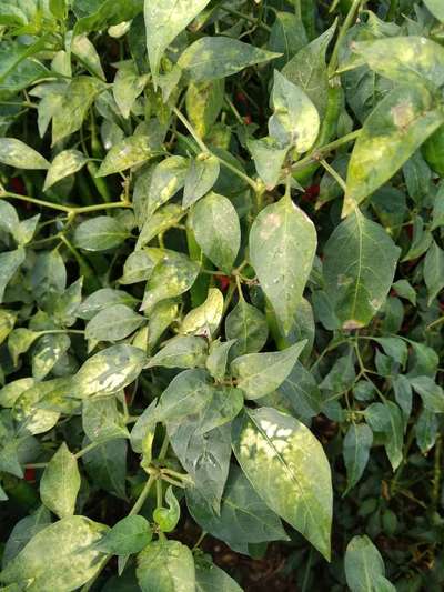 Hi Nagi Reddy ! Your crop is affected by Iron Deficiency and Anthracnose of Pepper . For details please click the link above.. Instantly give one spray of iron EDTA followed by copperoxychloride fungicide 0.25% solution in water. Your problem will be resolved. Thanks for visiting plantix community