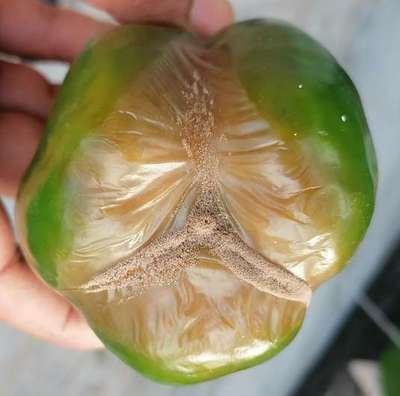 Nearly all small green peas to lemon size Capsicum Fruits are getting di-coloured & dying. Inside its getting black coloured rot on seeds formation.
