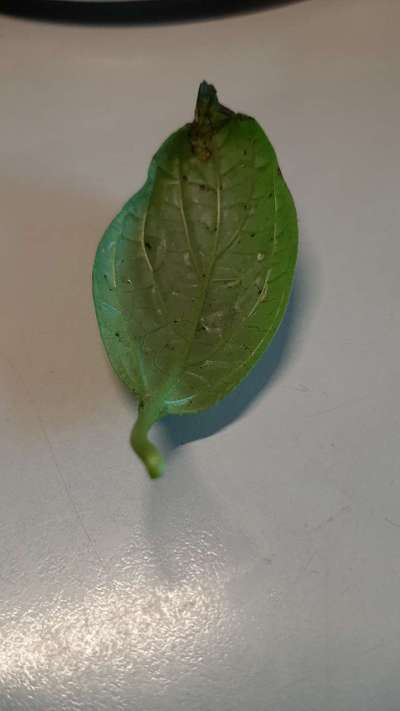 Both of my " mini Rocoto brown " plants show what you see in the picture : leaf tips dry off , black spots on and under leaves mostly near the tip . All leaves bend/curl downwards , older leaves get it first . Big pot , fertilizing should be ok ( hakaphos soft elite ) including calcium/magnesium . None of my other chilies have that , no pests at all . Any ideas ? Thank you