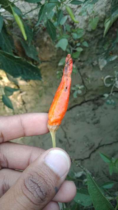 Ghulam Mustafa as u can see in every mature fruit there is a small hole . It's is caused by Chilli fruit borer .Fruit borer, Helicoverpa armigera is a polyphagous pest and the peak activity is noticed in October to June month... Control: Growing Marigold in chilli field: due to yellow colour of flower it attracts insect pest for egg laying this helps to manage pest incidence to some extent. OR: Spray endosulfan 35 EC 2 ml/lit carbaryl 50 WP 2 g/lit or B. thuringiensis 2 g/lit