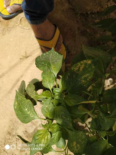 Learn more about PlantixDark yellow spots over the leaves in green chili plant in 2-3 days I could see red colored 🐞beetle on 2-3 leaves Adjacent plants are brinjal, capsicum and bitter guard