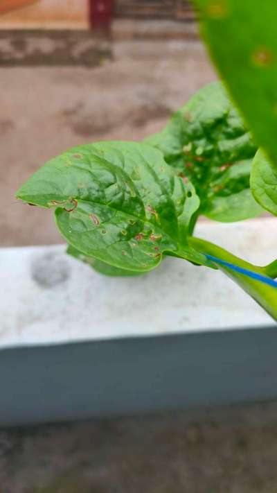 The plant is spinach,(called cheera in Malayalam) one month old. White spots appears below the leaves. Can't find any bugs or fungus. The topside of the leaf appears blanched, i.e. lacking the green colour. Then the affected part dries off.
