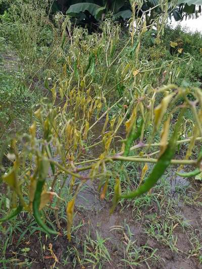 Hi Farmer. Your chilli crop is severely effected by Fusarium Wilt . Click on green link for checking symptoms and taking control measures from Plantix library.
