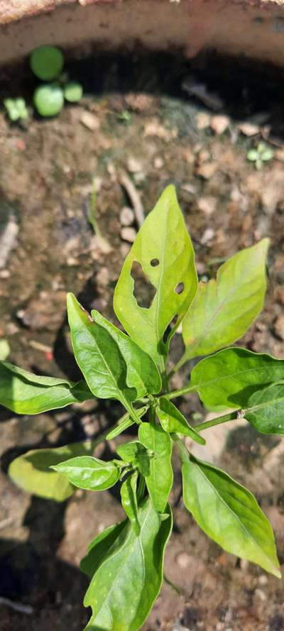 Recently , I have seen ants on my 3 weeks old chilli plant. Red ants are on my plant. Also, some leaves are getting holes is them. Please help.