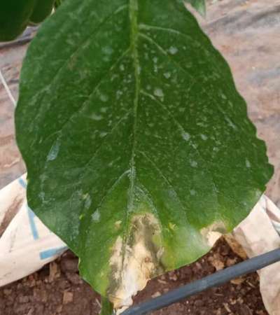 White spots on the bell pepper leaf with the tip of the leave looking dry