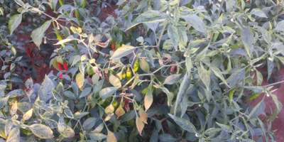 Hi H.Eedanna. Your chilli crop severely effected by Powdery Mildew of Pepper , Potassium Deficiency and Chilli Leaf Curl Virus . This virus translates through vectors like Whiteflies . Control vectors to control this disease. So, click on green links for checking symptoms and taking control measures from Plantix library.