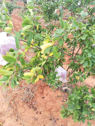 It mostly happens when cold wave passes from orchard. You have to incerease temperature of soil and ambient. 1. Do smoke in the evening. 2. Try to give irrigation in night. 3. Fertigation Magnesium Sulphate 3 kg + Urea 4 kg (It soil test report shows normal nitrogen) for 300 plants weekly once in addition to your regular fertigation schedule as your plant is in fruit development stage. 4. Fertigation Sulphur 80%wdg 2 kg for 300 plants once in 15 days. 5. Present days pin hole borer is observed in most area. Wash the stem with Nuvan 2.5 ml / lit water.