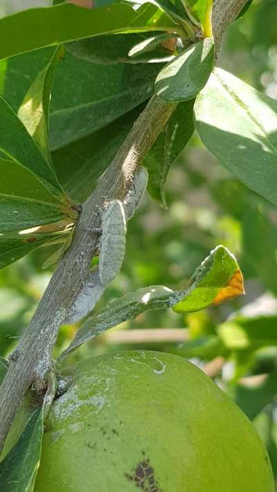 Hi Amir as per image it is known as female Mealybug Now a days they are much active. You can get all information about this pest by clicking the above ☝green link. I'm als sharing a link of community post where few information about their organic control are also mentioned. https://plantix.farm/KNP644X5mv6TswuDA