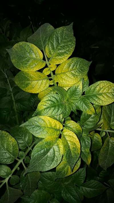 I have two potato plants. I am noticing the past days that potato no1 keeps growing as less green than normal (I am comparing it with potato no2) Potato no1 was suffering late blight, so I was using solution for this the past (maybe there is a root rot issue). Potato no1, seems still suffering something I not sure what it is. I have included pictures for the lower leaves because they seem little dying. Previously I have posted an issue and applied a solution for late blight, the leaf I posted is surviving so far, and disease not spreading on it, but not sure what is happening for all other lower leaves.