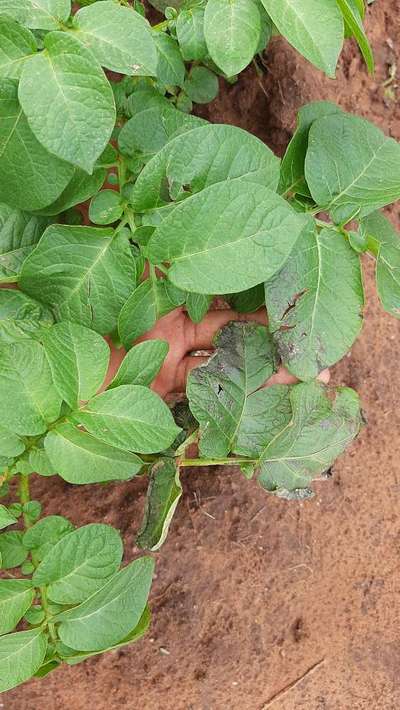 This potato plant has been growing without any problems (plant is two months old and temperatures are starting to drop as we go into winter). During the past week the lower leaves started wilting and turning dark. What could be the problem? please help.