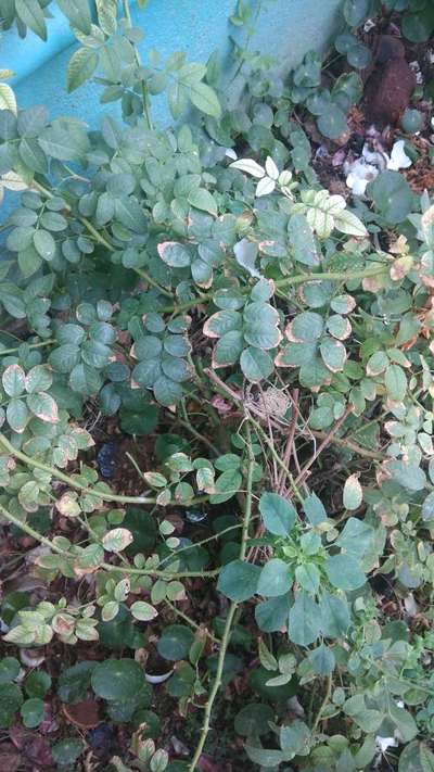 Hi Kasthuri . It's showing symptoms of Potassium Deficiency and Iron Deficiency . Click on green link for checking symptoms and taking control measures from Plantix library. Clean weeds, if any. Apply good amount of Farm Yard manure or Vermicompost once in 6 months to get good growth. Don't do overwatering and direct watering on plant. Don't allow soil to become water logged. Try to care your rose plant well.