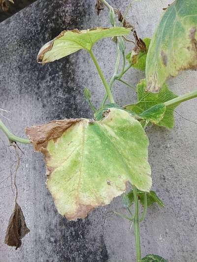 Downy Mildew on Cucurbits . kindly refer plantix library for more information and description of the problem and management. click on blue link to access the library. thanks