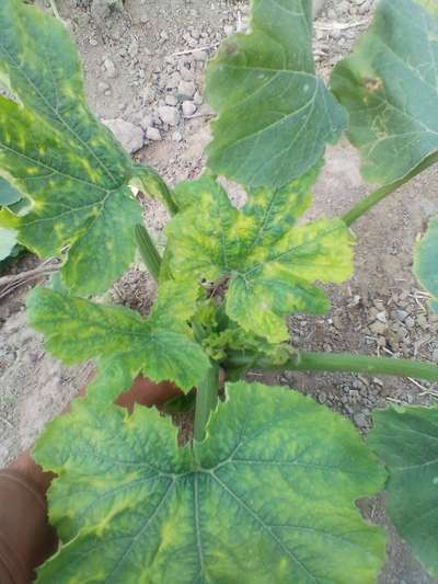 why this pumpking plant gelling pale yellow and burning ? it has white spots please help me to save them ! please advice me for treatment
