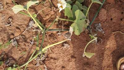 Tinku In your plot following are the problems along with control measures 1. Downy Mildew of Cucurbits : Spray Cabrio Top or Curzate 2. Fruit drop: Spray Planofix and drench with 12:61:00 + boron. 3. Check for symptoms of Melon Fruit Fly damage and if observed install Pheromone traps.