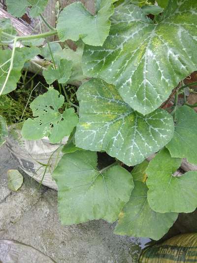 why this pumpking plant gelling pale yellow and burning ? it has white spots please help me to save them ! please advice me for treatment