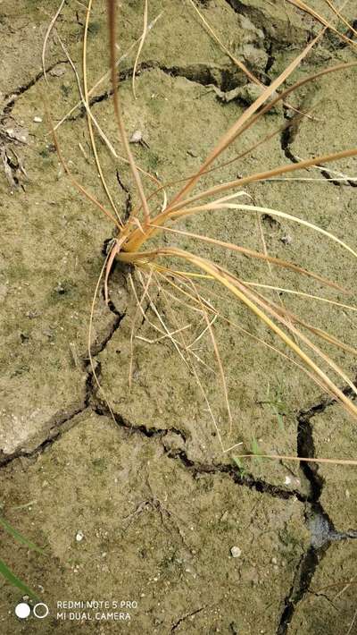 Seems like shortage of water as land is seen cracked as drought ... Post a pic of large area of the field so we can analyse the situation .