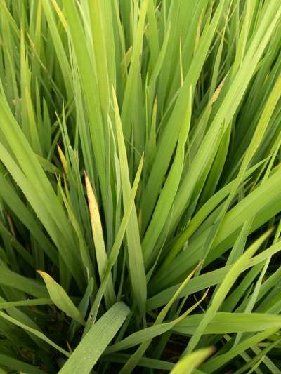 Dear Ravinder Bawa In case of Nitrogen deficiency, usually the older leaves get yellow due to translocation of nitrogen ( being highly mobile ) from older leaves to growing parts of the plant , usually younger leaves. This phenomena is not observed here , hence it may not be nitrogen deficiency. It may be initial stages of bacterial blight , where the infection starts at the tip of leaves spreading downwards , the area around the affected portion turning yellow. Spray 0.5 gms Streptocycline AND 3 gms copper oxy chloride in a litre of water. About 200 litres of solution may be required per acre. About 100 gms of Streptocycline AND 600 gms of copper oxy chloride may be required per acre. Repeat the spray after 15 days. Good luck.