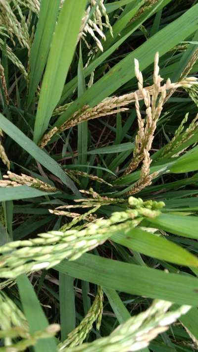 It's caused by Asiatic rice borer, compare the symptoms Asiatic Rice Borer .