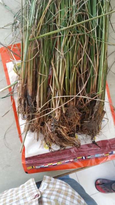 Paddy crop with blackening at the base of the crop,leaves becoming brown.