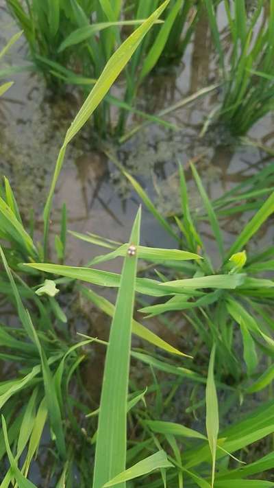 Hi. One possibility is Percevejo grande do arroz/Percevejo-do-colmo-do-arroz Please check the links to see description of the symptoms and control measures Percevejo grande do arroz/Percevejo-do-colmo-do-arroz