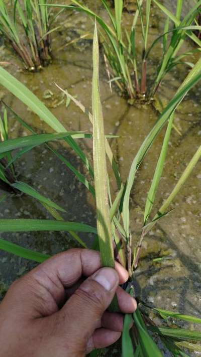 Please suggest the cause of discoloration in hybrid paddy variety. NPK applied already.