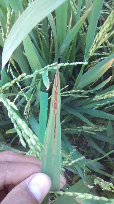 Hi Raghuraju. It's showing multiple symptoms like Brown Spot of Rice , Bacterial Blight of Rice and Bacterial Panicle Blight . Click on green links for checking symptoms and taking control measures from Plantix library.