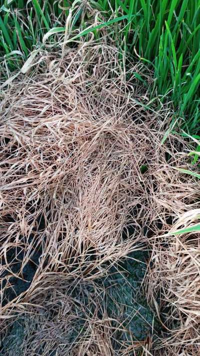 15 days old TKM 13 Varity paddy crop (after transplantation). The white patches are found in most of the plants. Please suggest the reason & control methods.