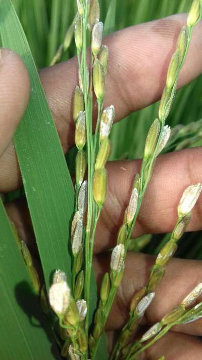 Learn more about PlantixSome kind of white layer is over grains and grains are empty. Could it be rice milk leaked out cause of some insect. I'm not sure.
