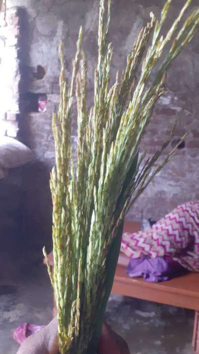 Hi Yellaswamy. Sent image is not clear and dull. Though on zooming, I think it's as Bacterial Panicle Blight and Rice Bug . Click on green links for checking symptoms and taking control measures from Plantix library.
