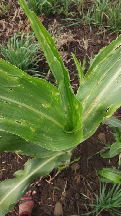 Dear Manoj Chavan It is stem borer Spray Quinolphos. 2 ml OR Chloropyriphos. 2 ml in one litre of water. About 200 litres of spray solution may be required per acre. Please take care to use proper concentration of pesticides and also mix the pesticide with water outside the sprayer equipment for better results. Alternatively you can also put carbofuran granules in the leaf whorls 4 kgs per acre. Good luck