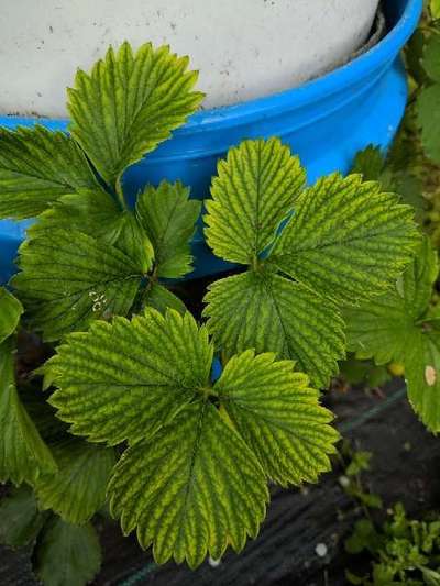 Hi. Need help with identifying the nutrition deficiency in my strawberry plant. The veins of the leaves are still green but the rest of the leaves are turning yellow. Any help is appreciated
