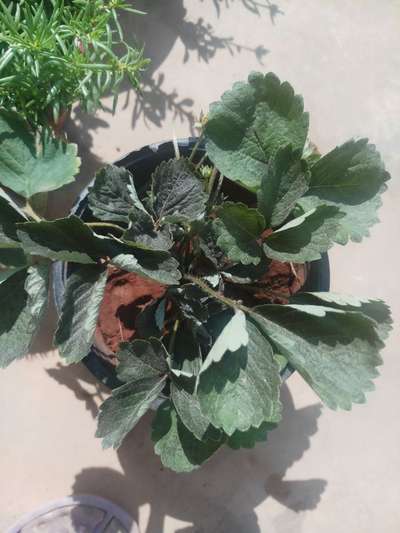 I got this strawberry plant from the nursery, and it's potted in rich red soil, initially I started noticing that its older leaves were curled upwards and started turning black, I did cut those off but then the new leaves emerging also have blackish specks. What could be the solution to this?