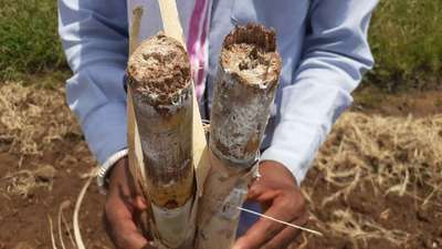 Ranjeet Pandey Pls open the internal tissues by dissecting longitudinally for observation if it is Wilt Disease of Sugarcane or Red Rot disease. From your picture it looks mostly to be suspected as Wilt Disease of Sugarcane. So you can review at platix library for comparison and various options on control measures.
