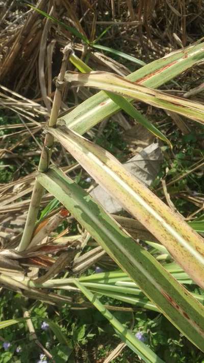 Hi Bhupender Singh. As per your sent image, your crop is severely effected by Red Rot and Eyespot of Sugarcane . Click on green links for checking symptoms and taking control measures from Plantix library.