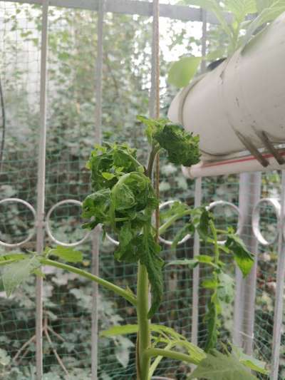 The tomato stem is growing in a flat shape in the upper area (not round). Furthermore, the leaves and the side branches are twisted into each other and have a unnatural shape. The plants were not treated with any pesticides.