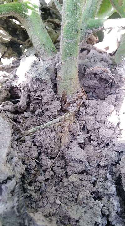 Its collar rot disease plant stem turm black and size reduce ultimately whole plant dead .....also this problem of late blight came with collar rot at a time .....so the best solution use fungicide through flood irrigation.....wisdom 80% granule 500 mg/acre used marketed by Ag Pharma evyol Group