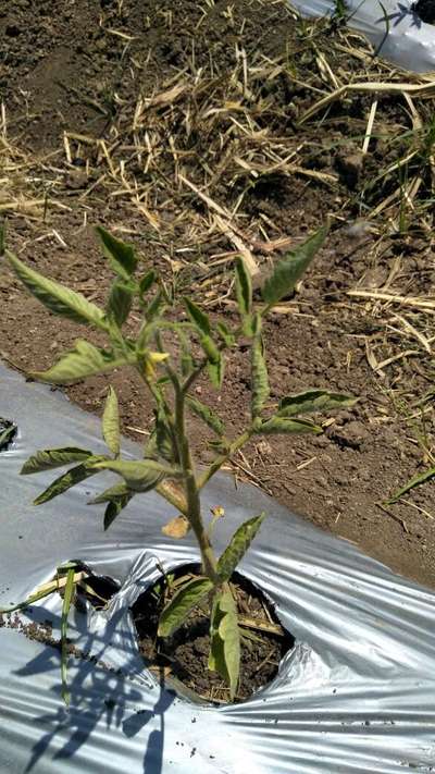 The tomato leaves turning yellow.