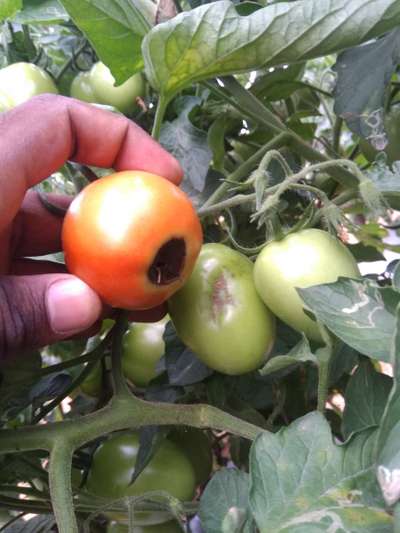Agree with Venkat Pawar. Sir this is due to deficiency called Blossom End Rot in tomato just use foliar of calcium chloride and remove the infected tomato from plants thanks for visiting plantix