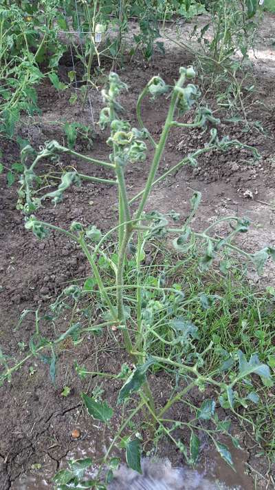 Lyle Liston Seems like that your plant might be infested with Broad Mite or Leaf Curl in Tomato infestation. Pls ck in plantix library by clicking on the green link for comparison.