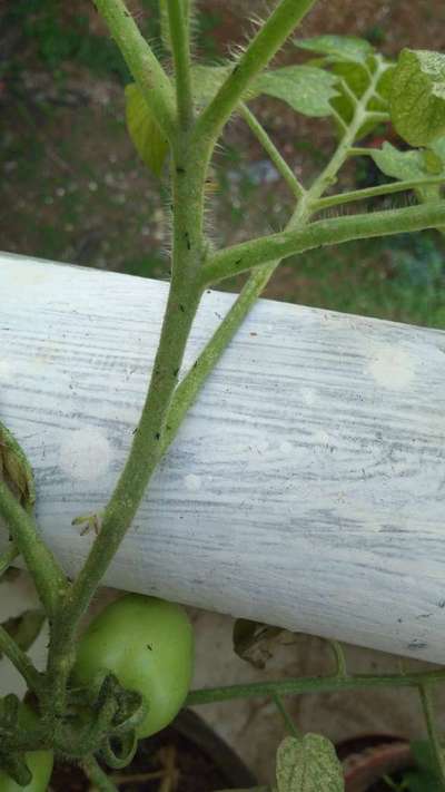 Learn more about PlantixThere are some black insects/bugs on stems of all tomato plants. They appear to be feeding on the stems. The tomato plants are a also affected by spider mites and white flies.