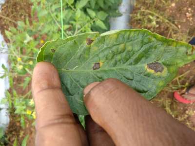 Hi Chandu. Check for Septoria Leaf Spot and Tomato Leaf Miner by clicking on green links given here for knowing symptoms and taking control measures from Plantix library. Also use fertilizer calculater, crop Advisory and Upcoming tasks sections available here on home page of Plantix to increase your crop productivity.