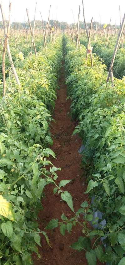 Hi Manjunatha Sk Manju Sk . The topmost leaves are showing more yellownes, lets check symptoms for Tomato Yellow Leaf Curl Virus or Potassium Deficiency by clicking on green links given here for knowing symptoms and taking control measures from Plantix library. Also use fertilizer calculater, crop Advisory, see all tasks and weather report sections available here on home page of Plantix to increase your crop productivity.